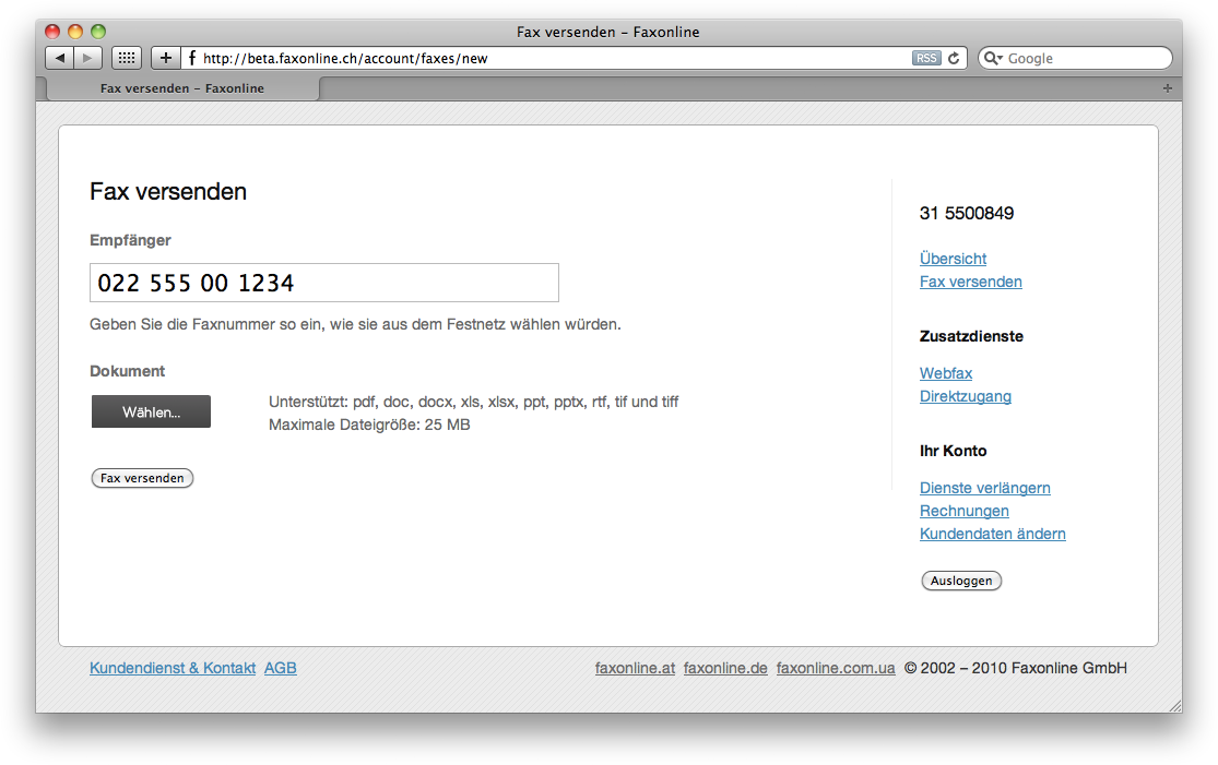Faxen Sie persönlich gestaltete Dokumente (z.B. Word, PDF, Excel, PowerPoint, …) direkt über die Faxonline Webseite.